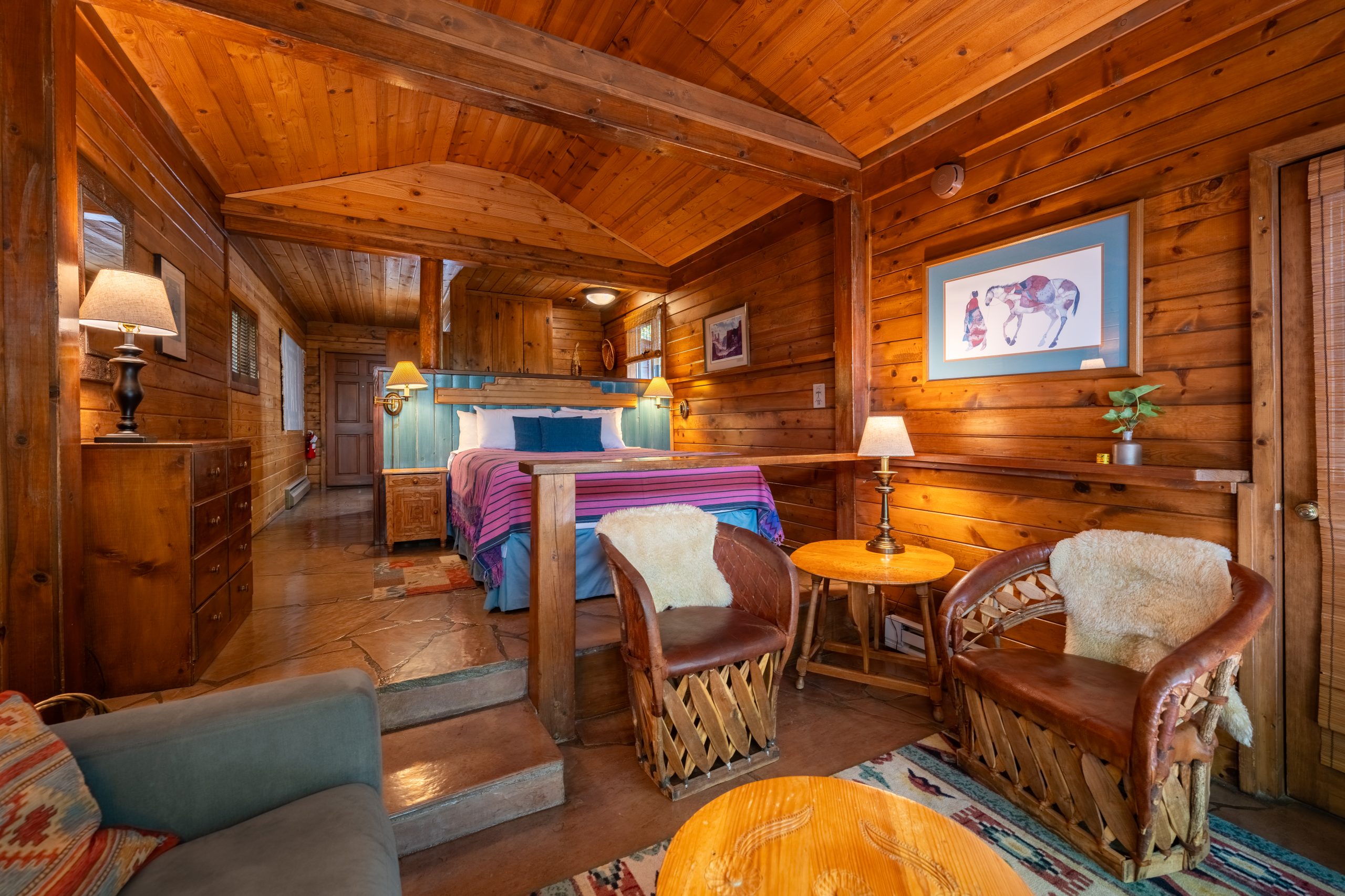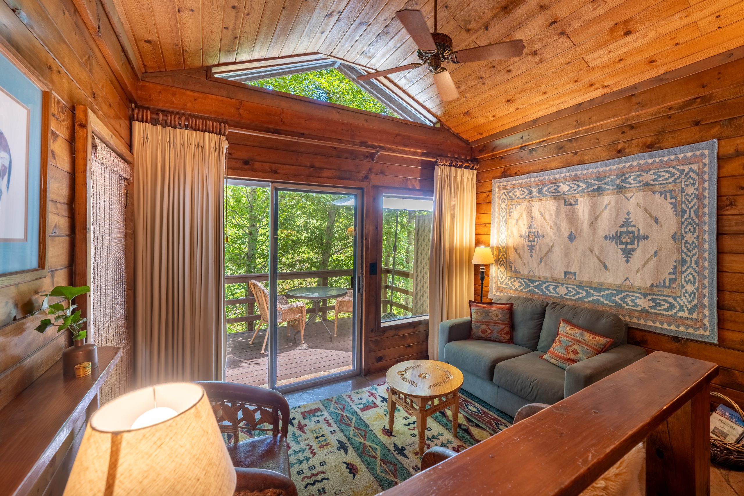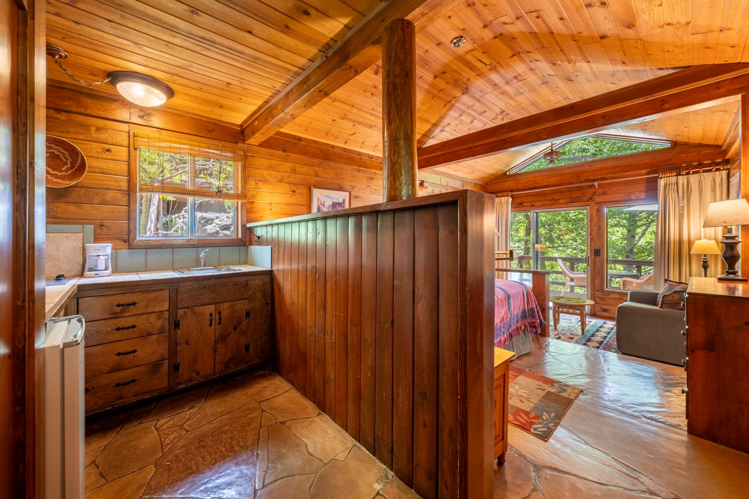 Deckhouse is one of our most romantic cabins, sought-after for its prime location directly overlooking Oak Creek. Once outside on the private deck you are immediately drawn to the beauty and sounds of the rushing waters below. A wood-burning fireplace outside will further enhance your experience. Deckhouse is designed to foster intimate and endearing memories.