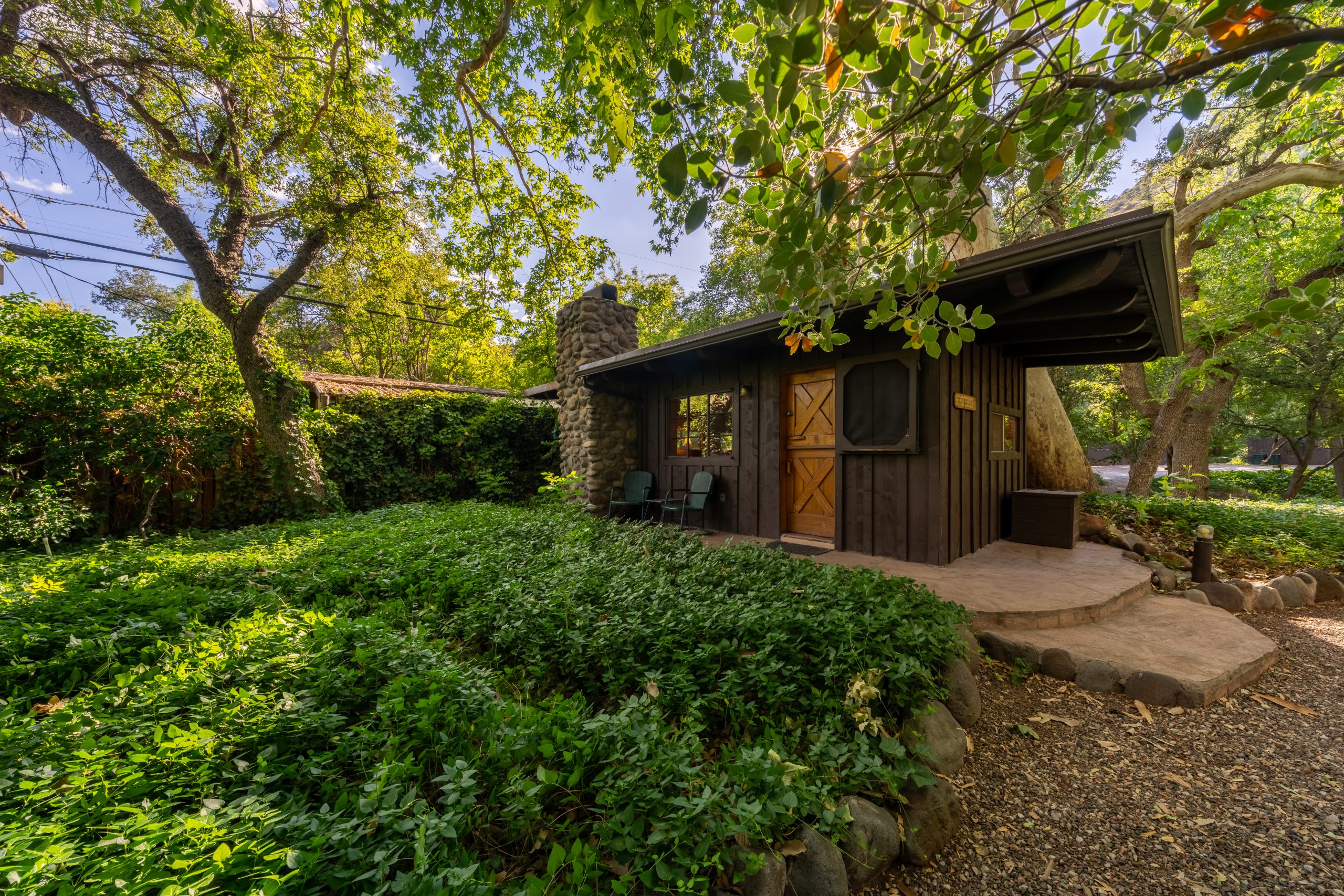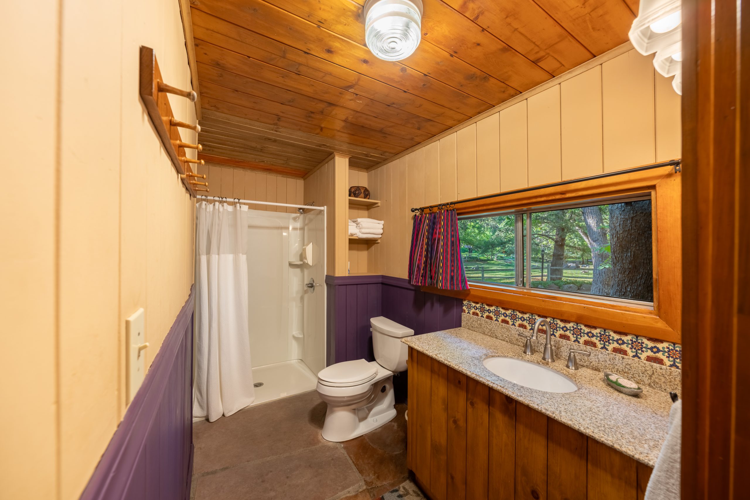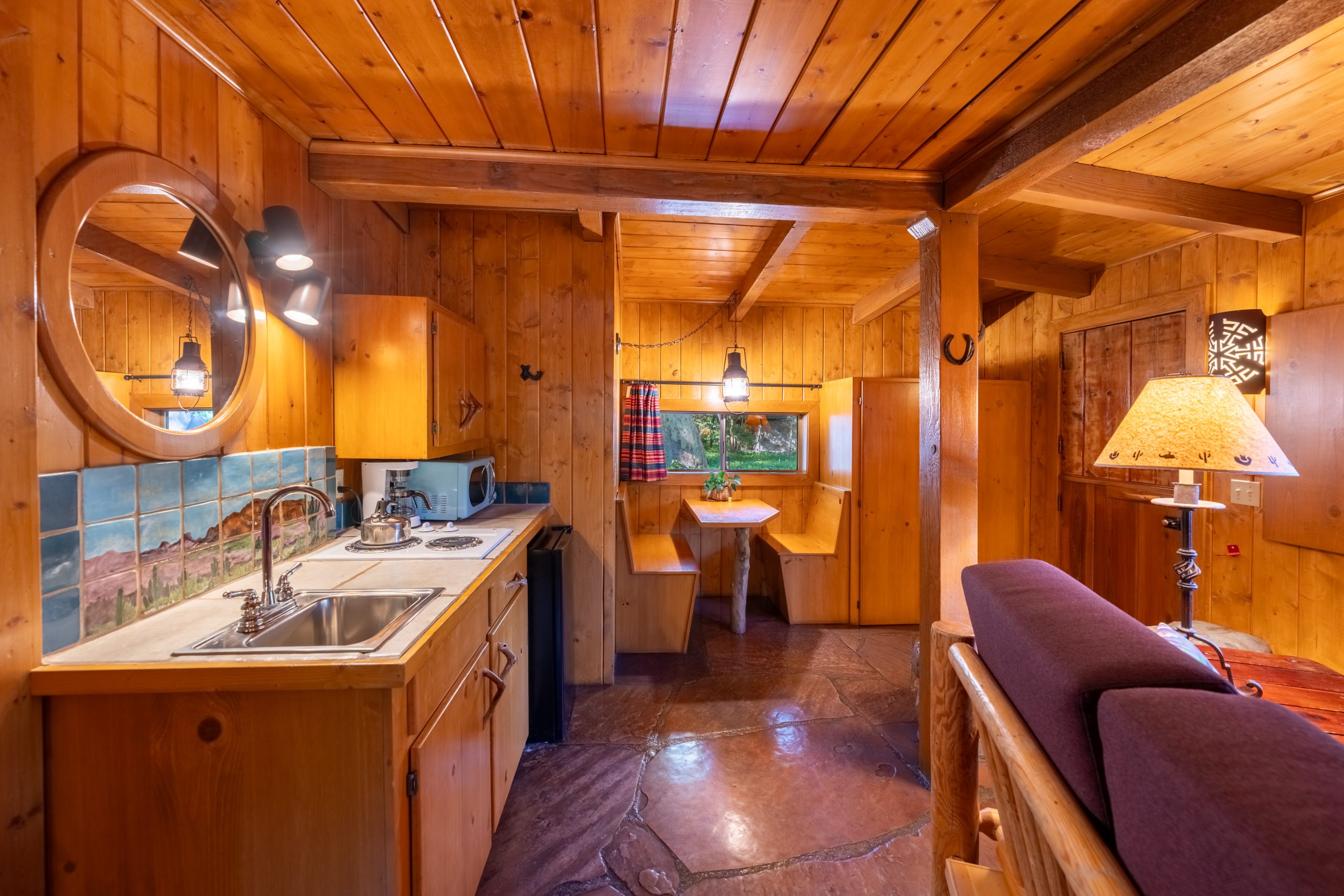 Kingfisher guests are sure to be mesmerized by the lyrical sounds of the rushing creek below. The best feature of this creekside cabin is it’s magnificent detached private patio that sits directly overlooking Oak Creek. Just 40′ from the creek the cabin itself is very cozy and romantic with the king bed looking onto a stone fireplace. There is also a twin daybed which can accommodate a third guest. It has a kitchenette and quaint little dining nook with a window that looks out at the towering Sycamore trees in the sheep pasture.