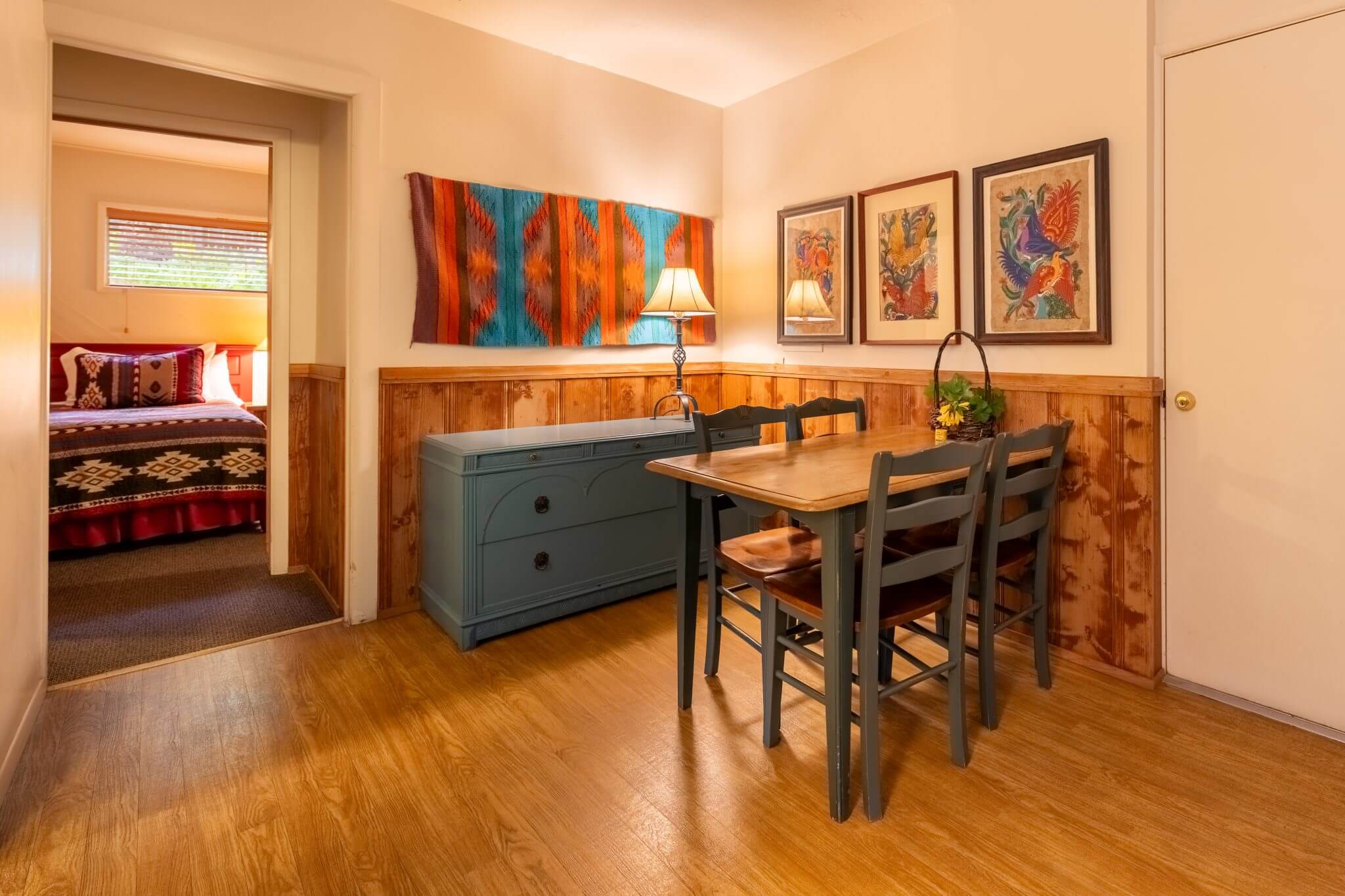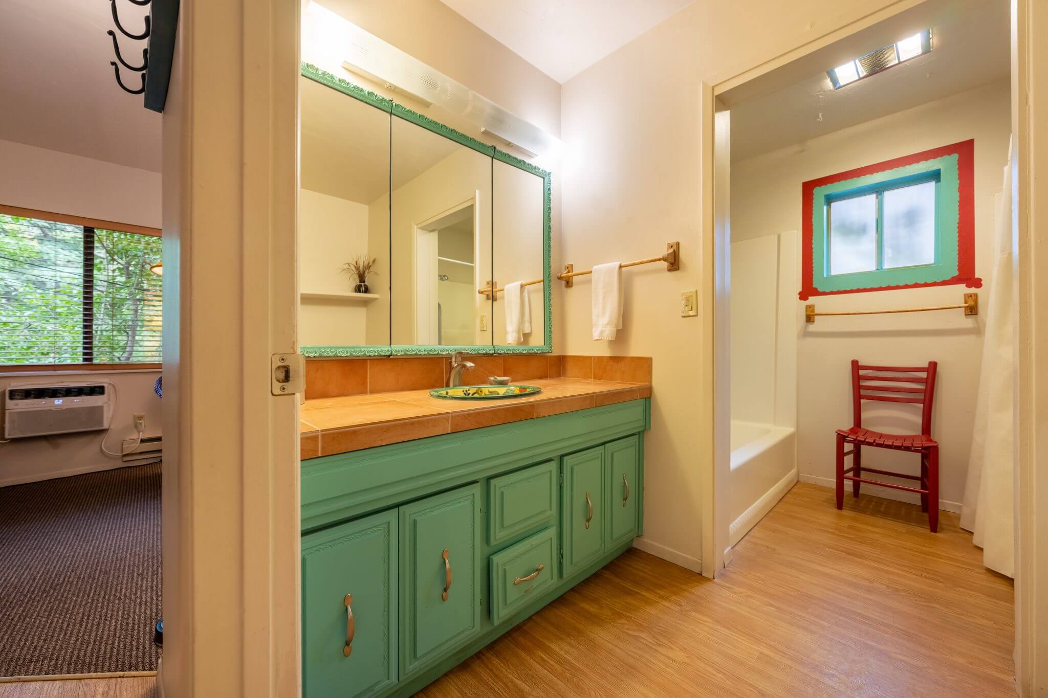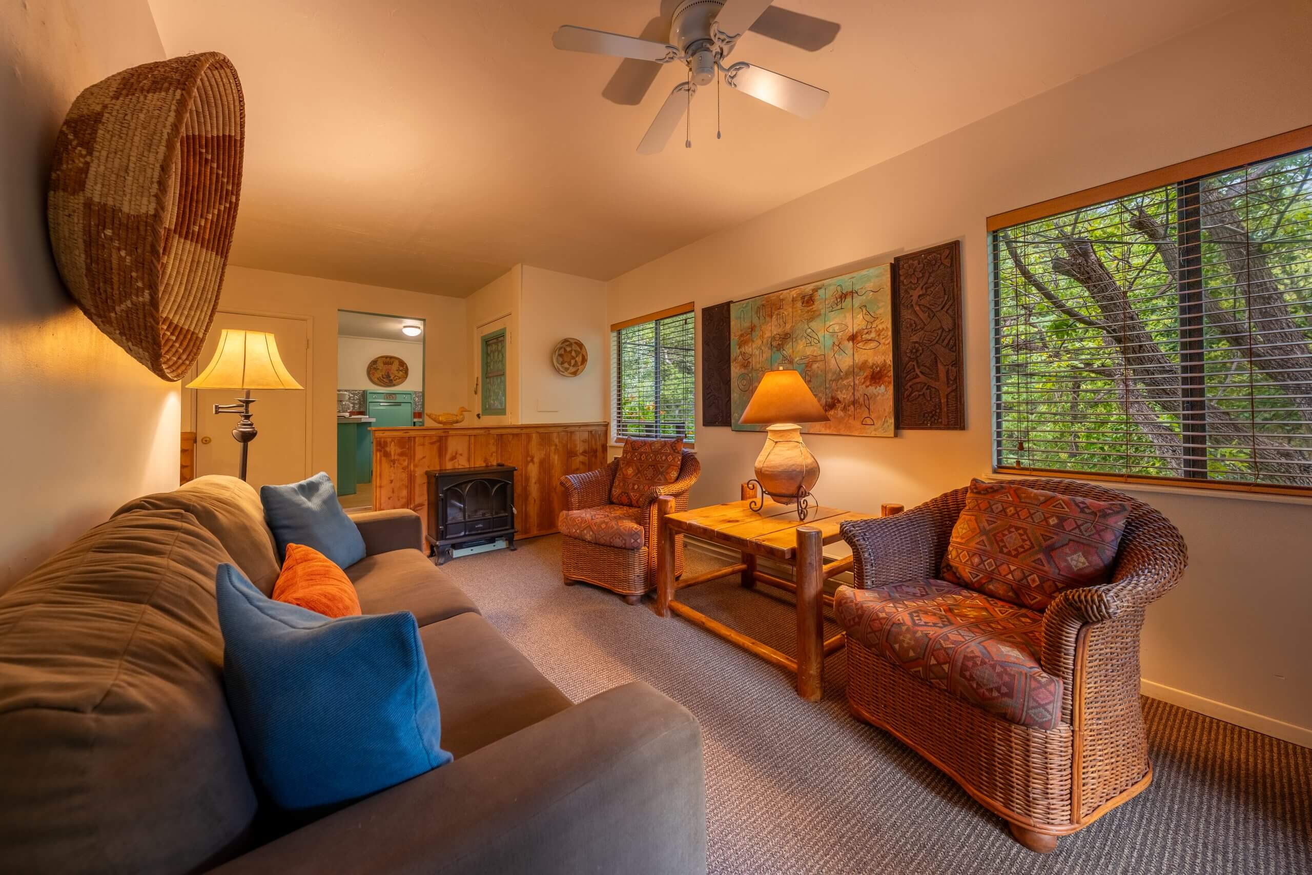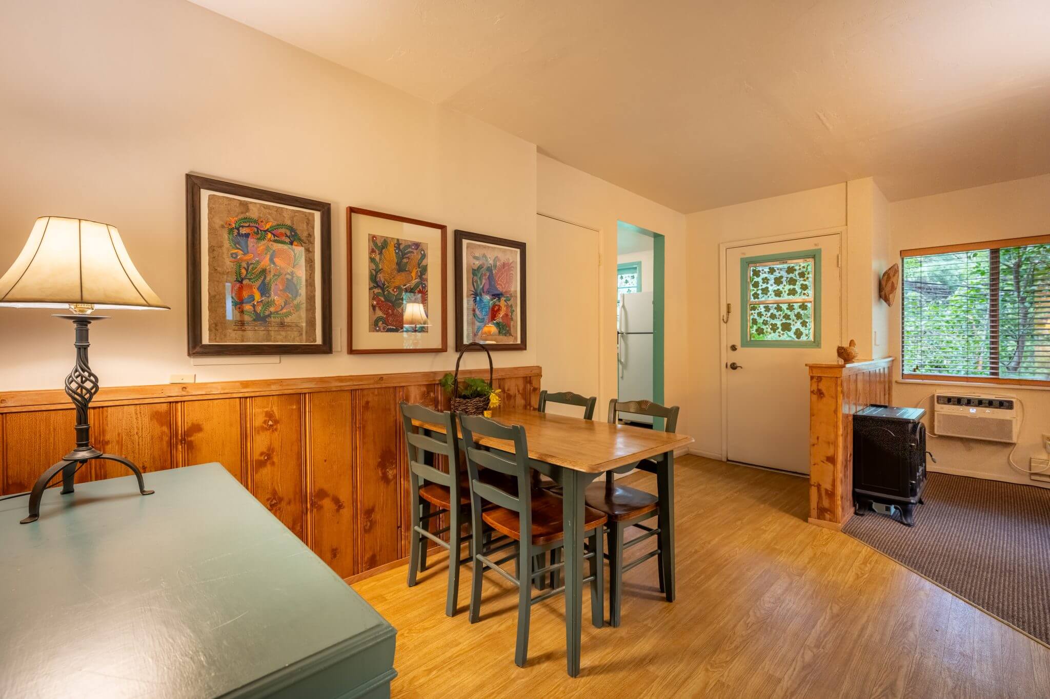 The Wren cabin sits high on the property with a private deck and large natural green space of Ivy and trees. The turquoise vintage kitchen is fully functional and adds to the experience.