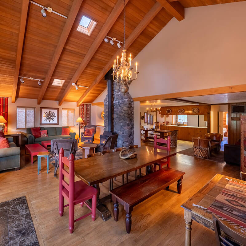 At Briar Patch Inn, groups can enjoy the spacious Ponderosa Cabin, which blends natural comfort with flexible indoor gathering space. Sleeps 9 and accommodates up to 49 for meetings or meals, featuring fireplaces, a large deck with red rock views, a full kitchen, and Wi-Fi.
