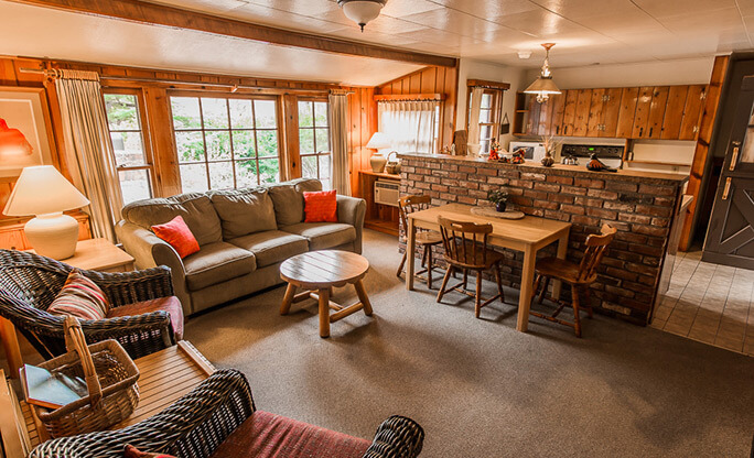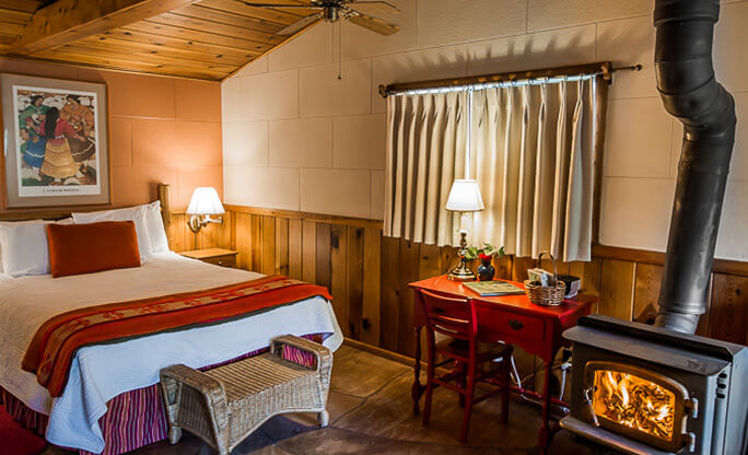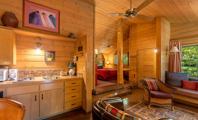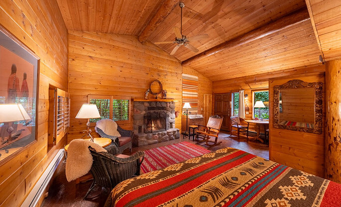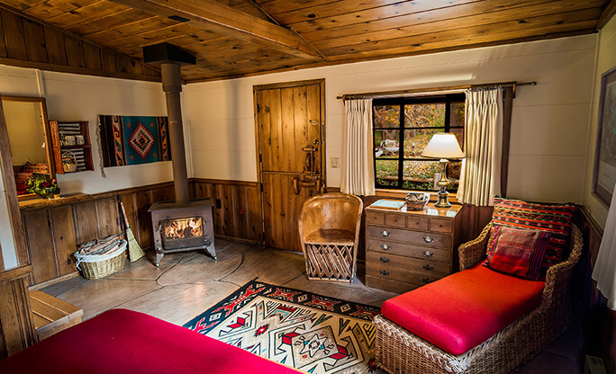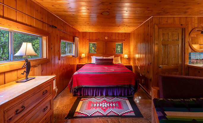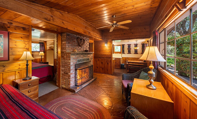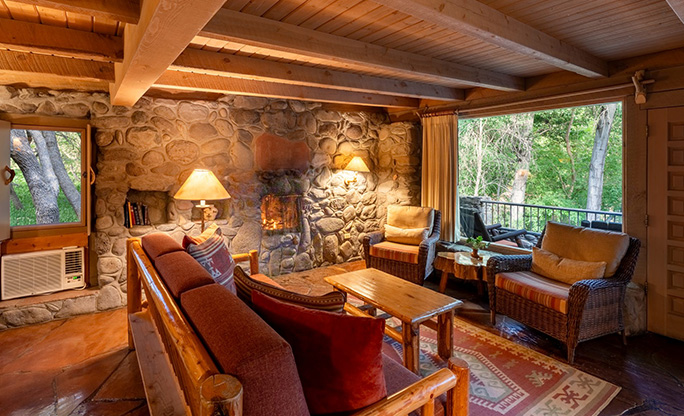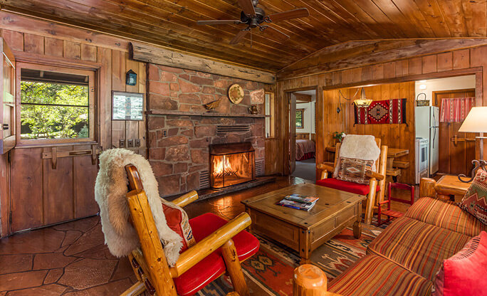 Acorn cabin, set beneath the shade of the majestic oak trees, just 70′ from the rushing waters of beautiful Oak Creek. A king bed, kitchenette, and comfortable living room along with a window seat provide a relaxing area to enjoy a book, alongside the woodburning stone fireplace.
