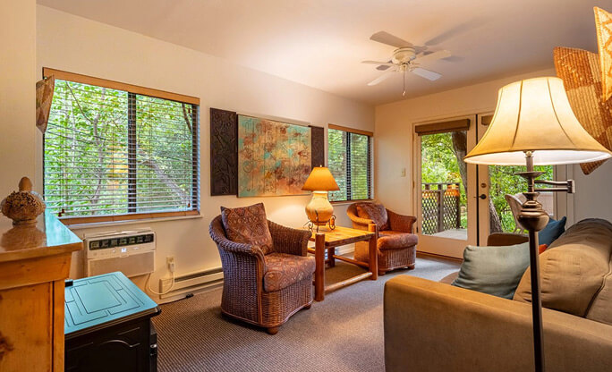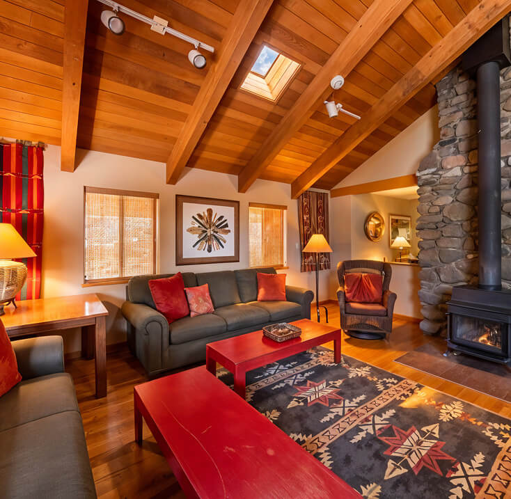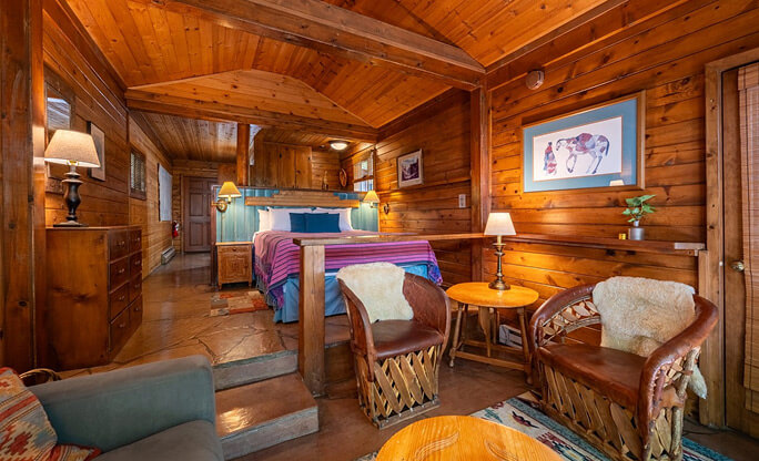 Deckhouse is one of our most romantic cabins, sought-after for its prime location directly overlooking Oak Creek. With a queen bed, a kitchenette, a bathroom with a jetted bathtub and shower combo, and a cozy sitting area that leads directly onto the private patio.
