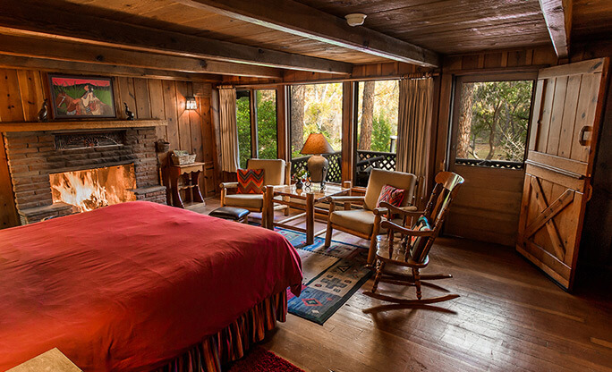 Eagle is about 200’ from the creek, set high on the property with glorious views of the natural paradise that is Briar Patch Inn. This was the living room of the original owner’s home, built in the 1940s. A king-size bed, a sitting area, and a wood-burning fireplace are gracefully blended to create a romantic and charming cottage.
